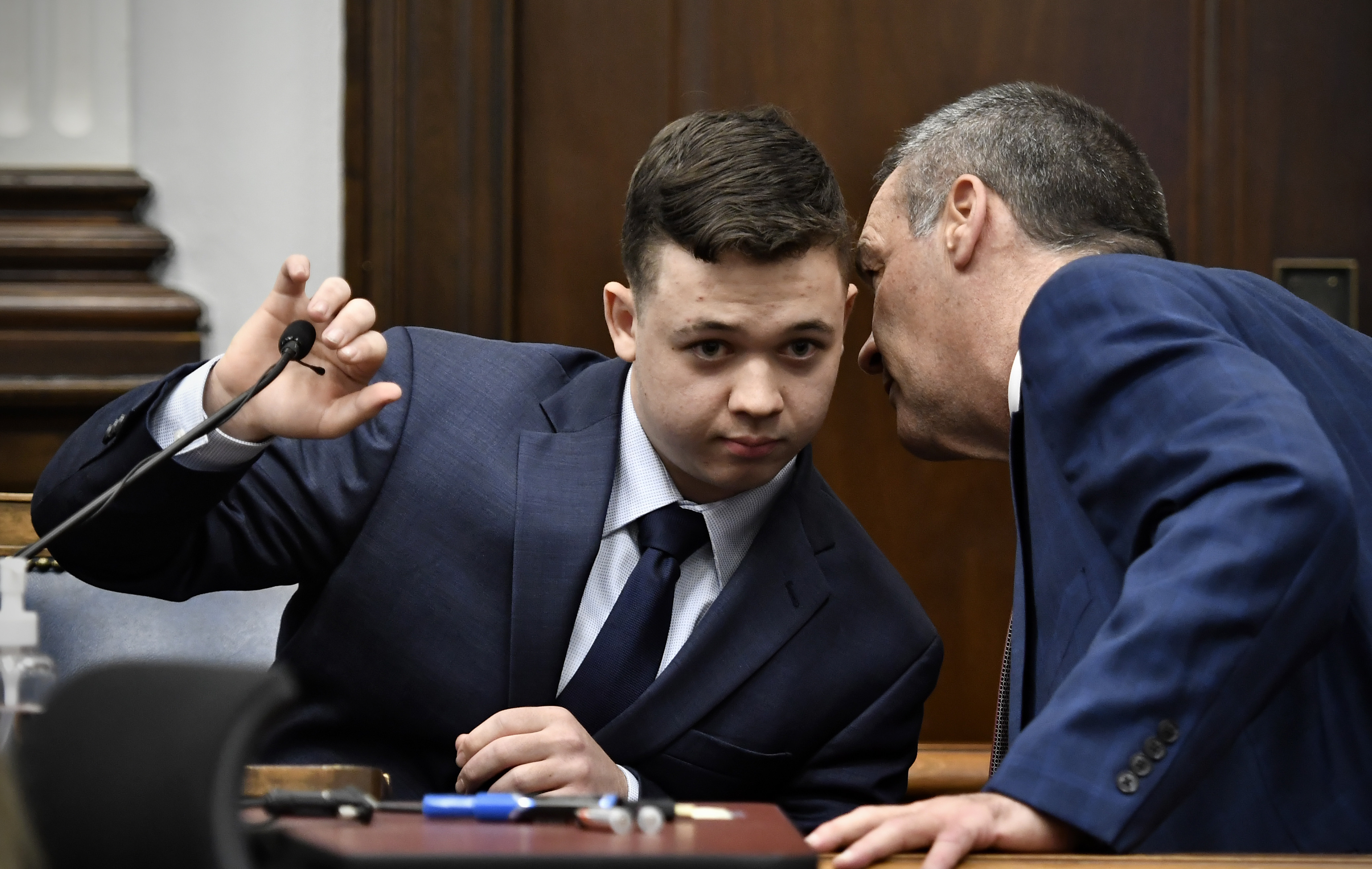 KENOSHA, WISCONSIN - NOVEMBER 18: Kyle Rittenhouse speaks with his attorneys before the jury is relieved for the evening during his trial at the Kenosha County Courthouse on November 18, 2021 in Kenosha, Wisconsin. Rittenhouse is accused of shooting three demonstrators, killing two of them, during a night of unrest that erupted in Kenosha after a police officer shot Jacob Blake seven times in the back while being arrested in August 2020. Rittenhouse, from Antioch, Illinois, was 17 at the time of the shooting and armed with an assault rifle. He faces counts of felony homicide and felony attempted homicide. (Photo by Sean Krajacic - Pool/Getty Images)SHARE