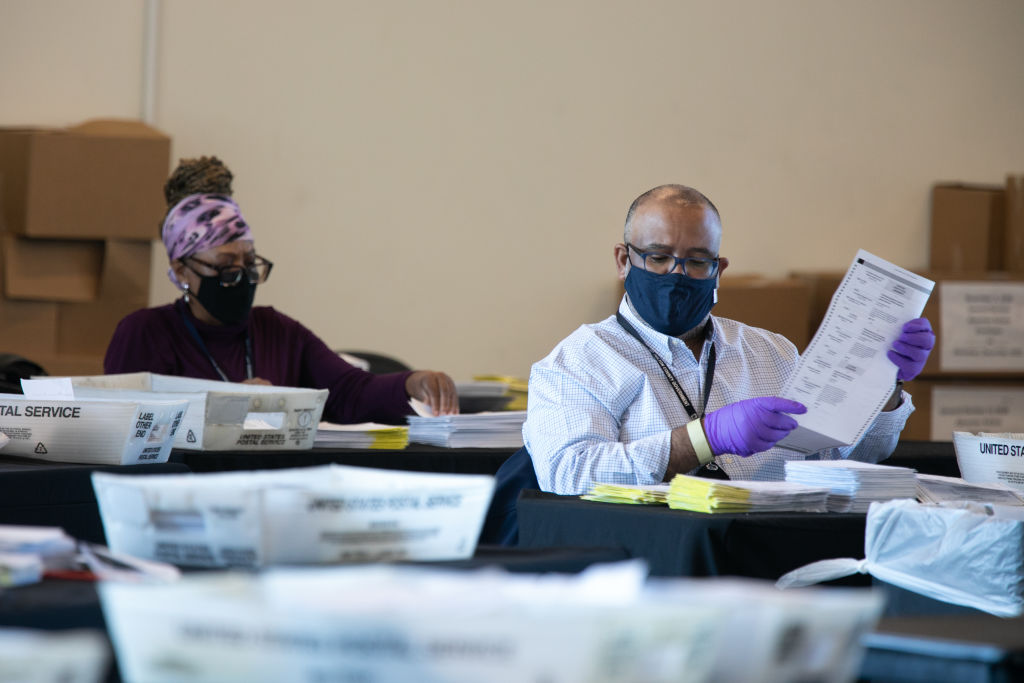ATLANTA, GA - NOVEMBER 03: Sitting next to a poll worker, a Fulton County voter casts a ballot at the Metropolitan Library on November 3, 2020 in Atlanta, Georgia. (Photo by Jessica McGowan/Getty Images)