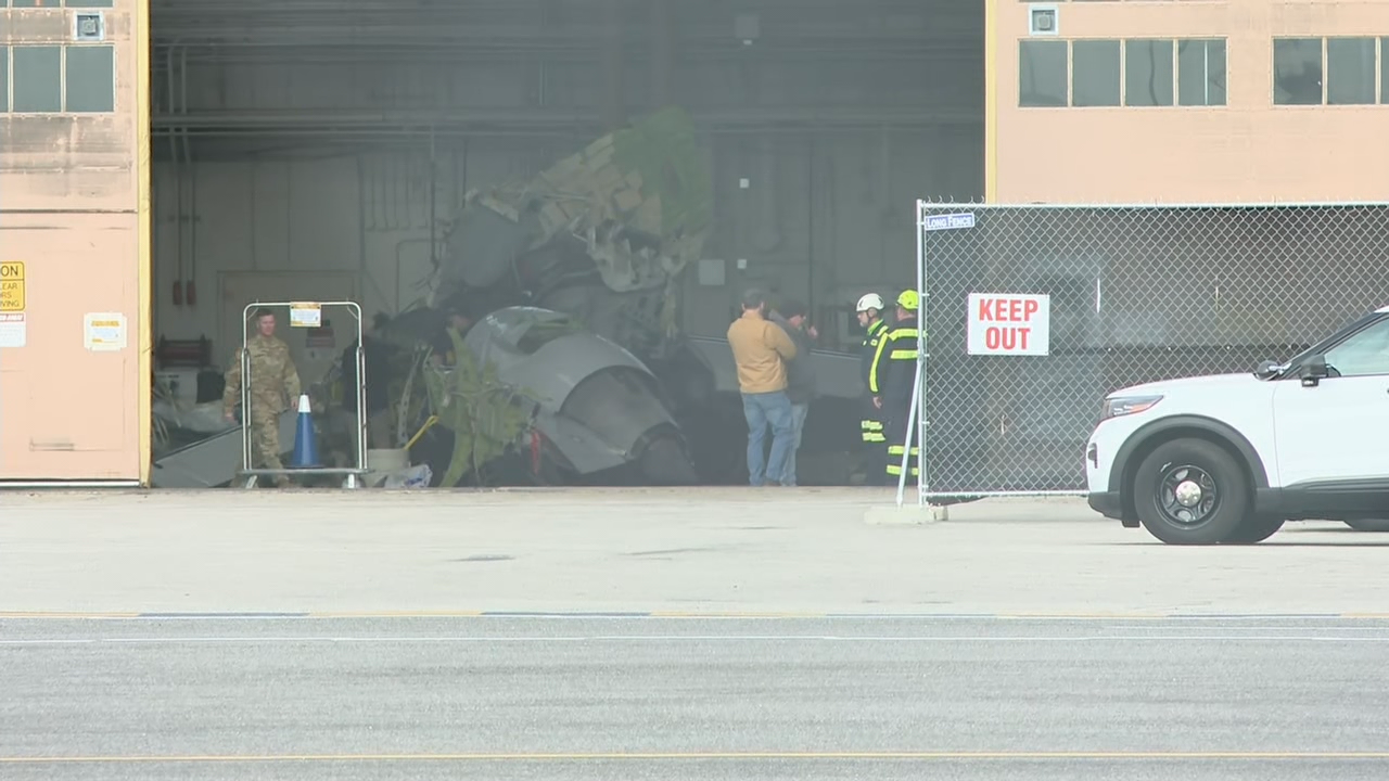 Crews on Feb. 7, 2025, review the wreckage from the Jan. 29 midair collision inside a hangar at Reagan National Airport near Washington, D.C. (Frank Becker/7News)