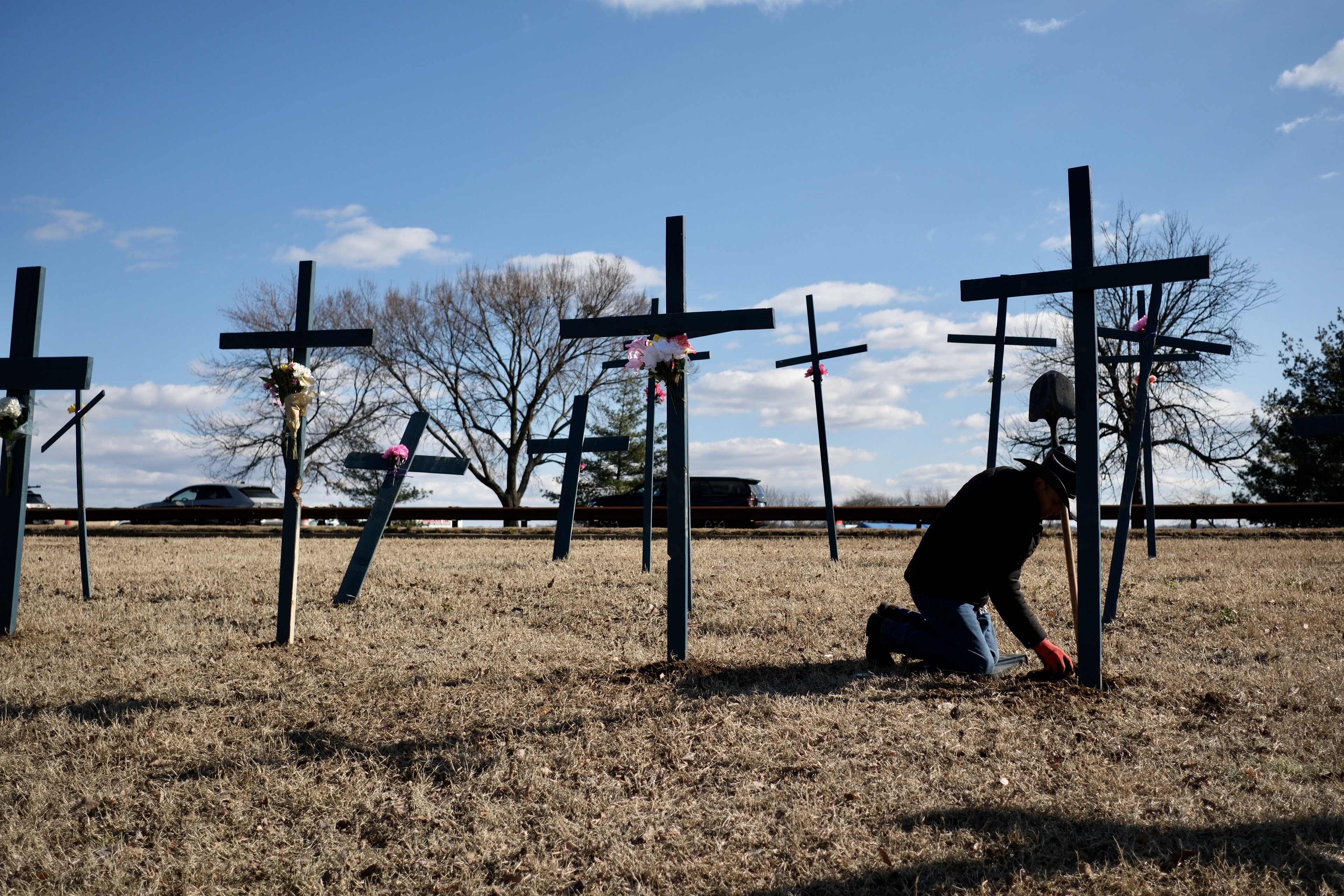 A memorial built for the victims of the Jan. 29, 2025 midair plane-helicopter collision at Gravelly Point in Arlington, Va. on Feb. 1, 2025. The artist, Roberto Marquez, traveled to D.C. from Texas to build the piece. (Marco Tavares/7News)