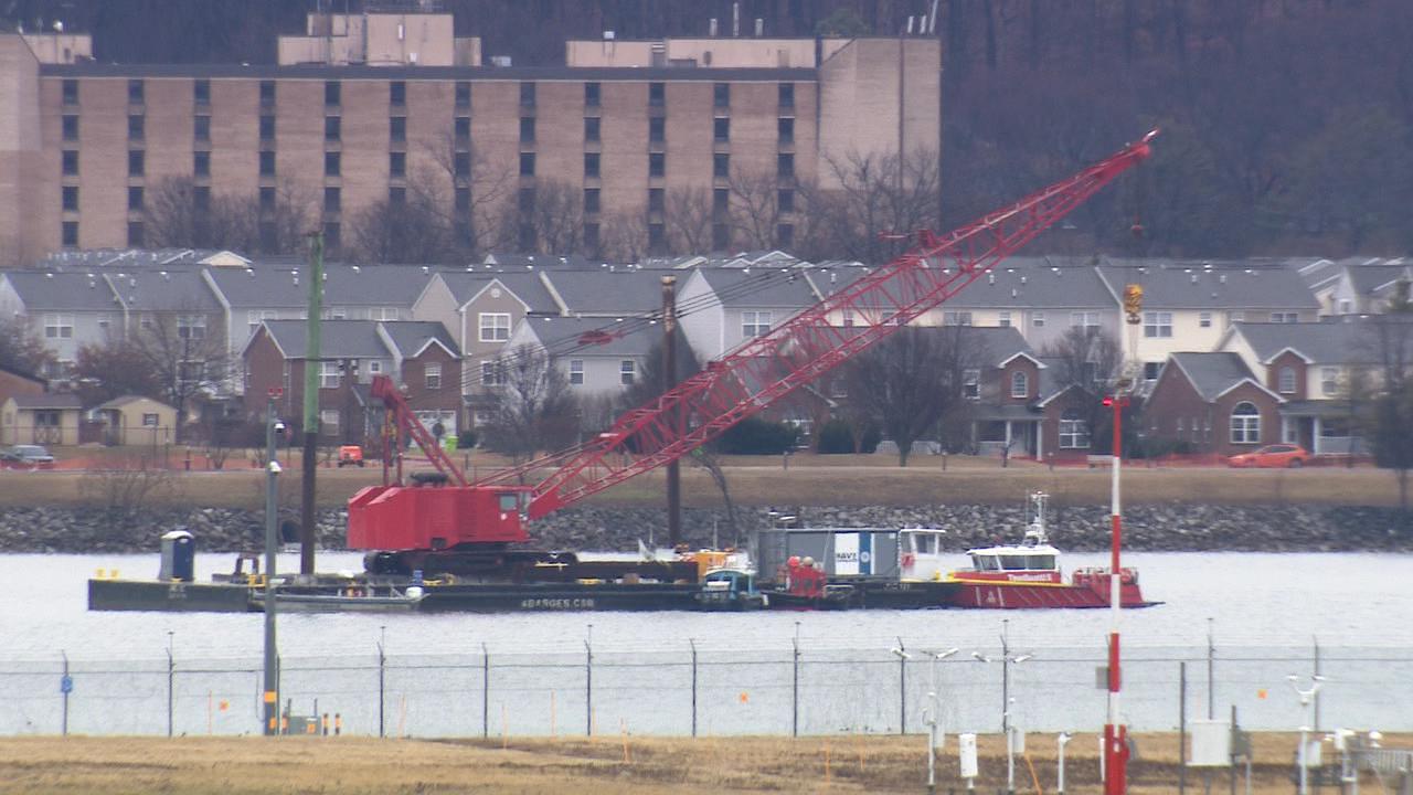 A crane on February 6, 2025 used for recovery efforts of the midair collision on the Potomac River. (7News)