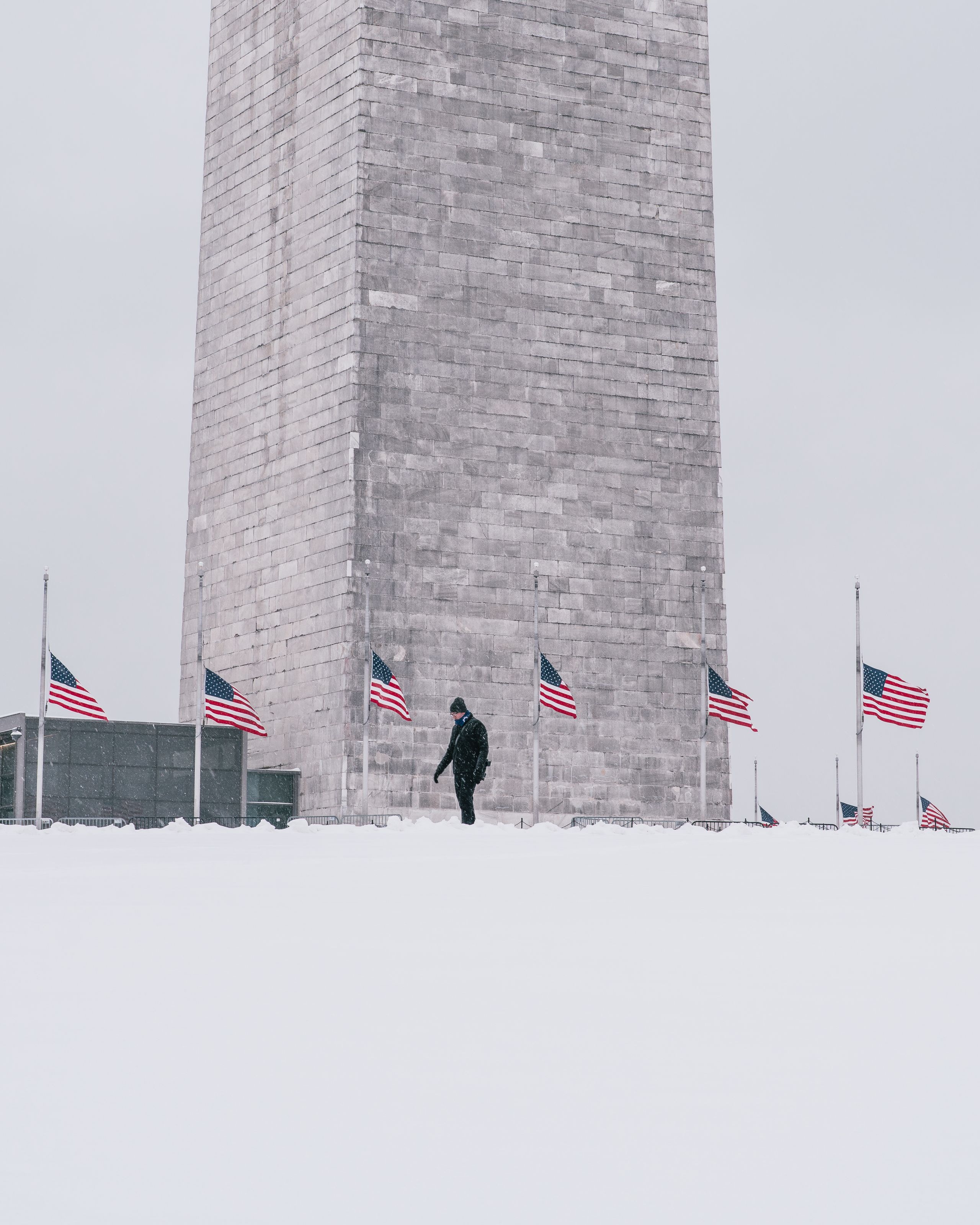 Snow day in Washington, D.C. on Jan. 6, 2025, with a backdrop of U.S. flags at the Washington Monument. (Jay Vizcarra/Chime In)
