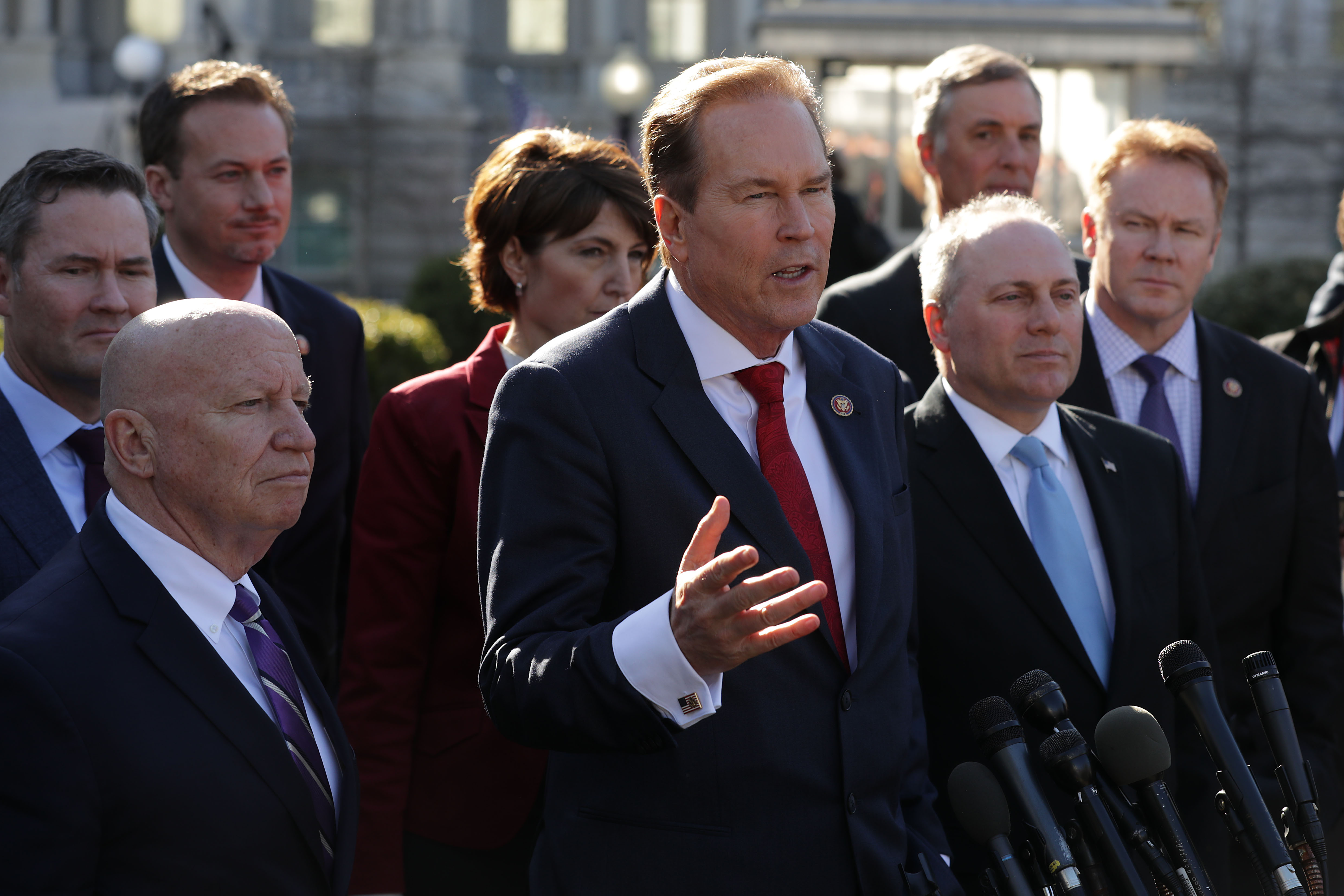 WASHINGTON, DC - MARCH 26: Rep. Vern Buchanan (R-FL) (C) is joined by fellow Republican members of the House while talking to reporters outside the White House West Wing March 26, 2019 in Washington, DC. The House Republicans met with President Donald Trump to talk about trade policy, including prospects for the United States-Mexico-Canada Agreement, or USMCA. (Photo by Chip Somodevilla/Getty Images)SHARE
