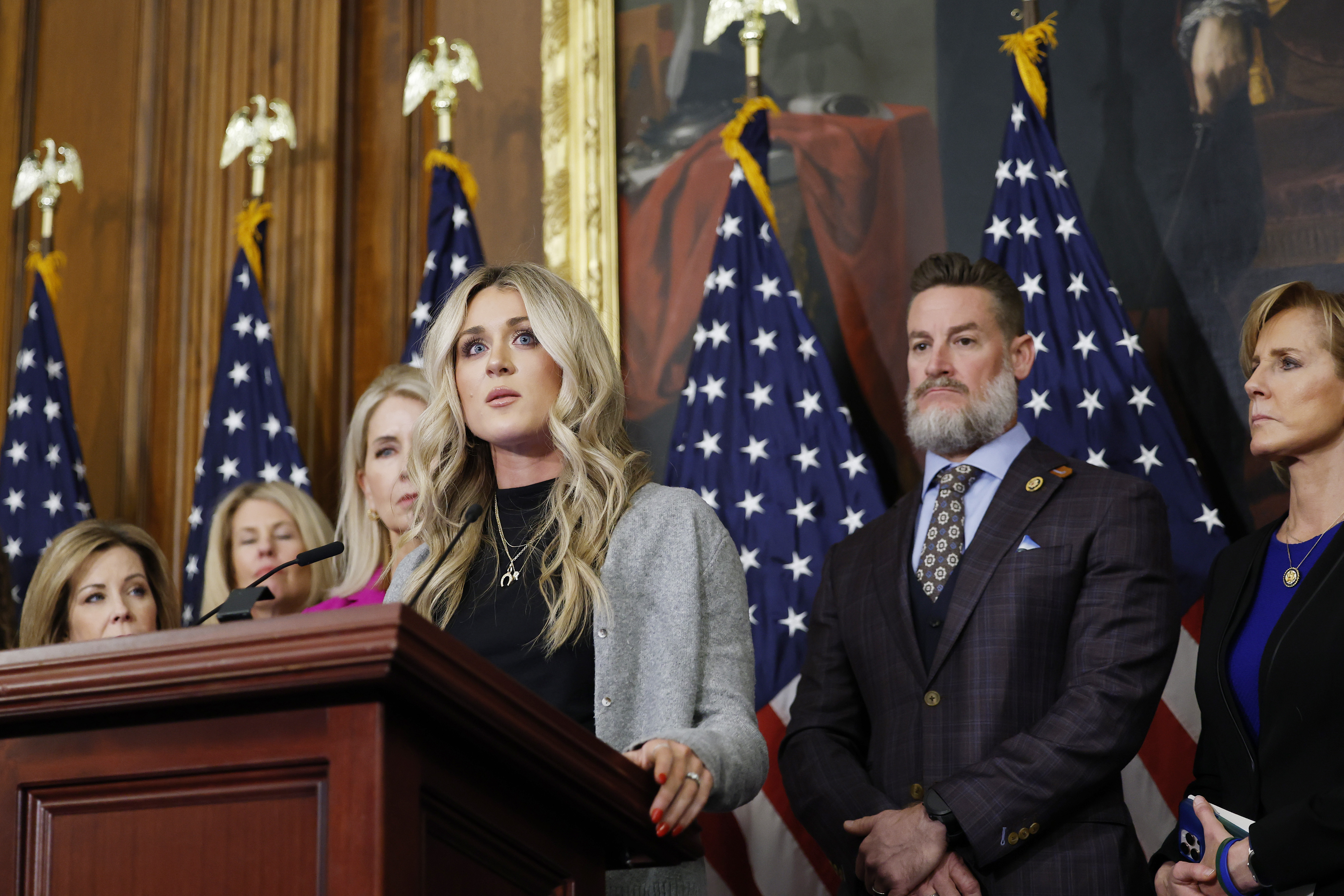 WASHINGTON, DC - JANUARY 14: Former competitive swimmer Riley Gaines speaks at a news conference following the House of Representatives vote on H.R. 28 - "Protection of Women and Girls in Sports Act" at the U.S. Capitol on January 14, 2025 in Washington, DC. The House of Representatives passed the legislation in a 218 to 206 vote to prohibit federal funding for K-12 schools that include transgender students on women’s sports teams. (Photo by Anna Moneymaker/Getty Images)SHARE