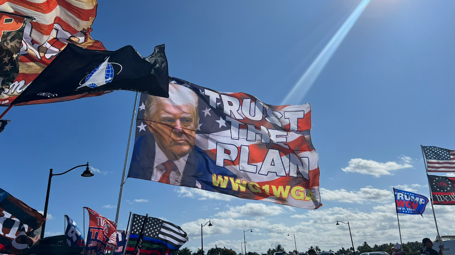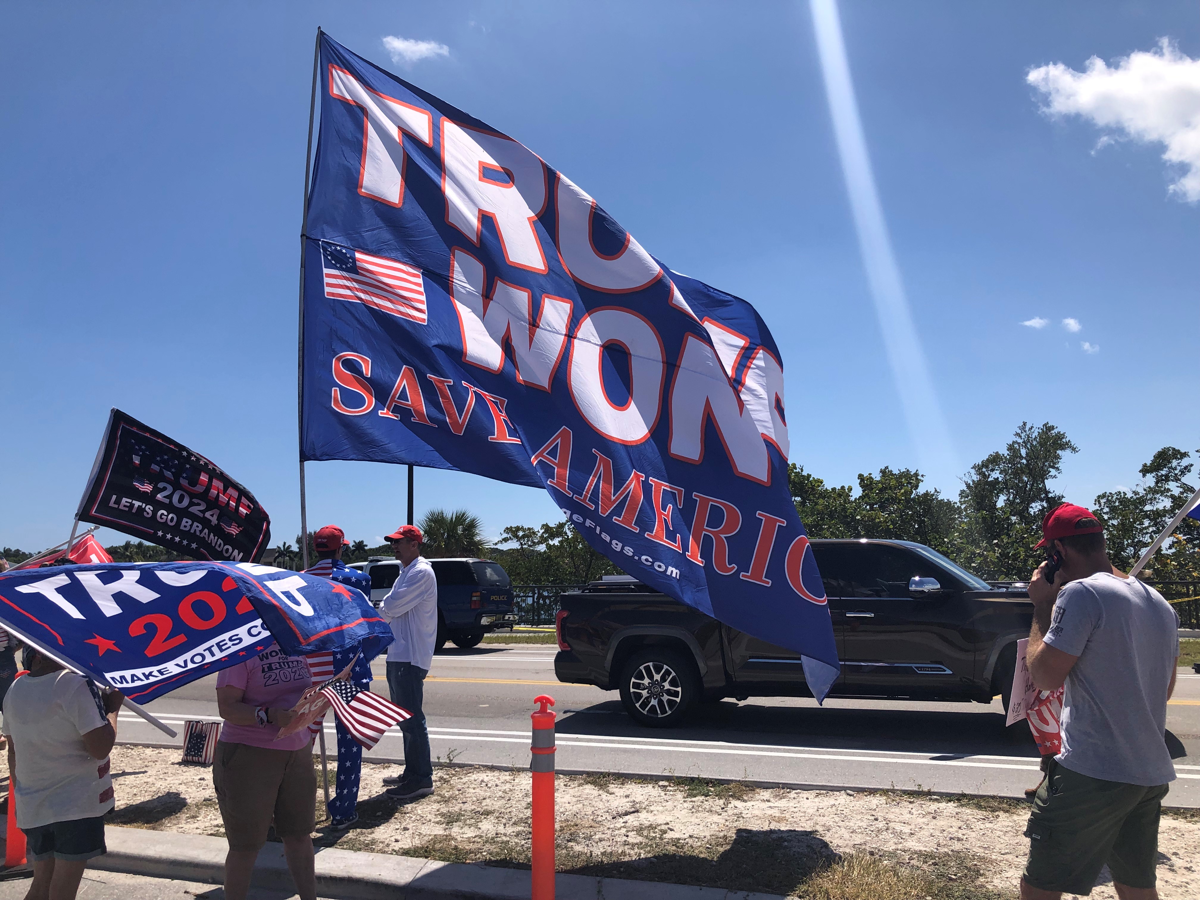 Supporters including state Rep. Meg Weinberger (left) and Laura Loomer (center) at Mar-a-Lago hold a golden road sign declaring a portion Southern Boulevard be renamed Pres. Donald J. Trump Blvd. (WPEC)SHARE