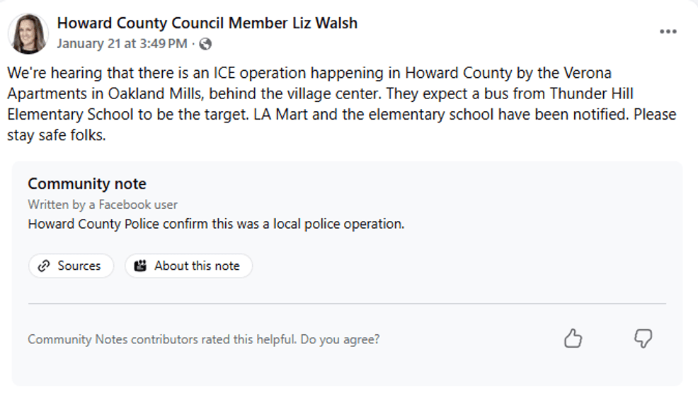 The post said, 'We're hearing that there is an ICE operation happening in Howard County by the Verona Apartments in Oakland Mills, behind the village center. They expect a bus from Thunder Hill Elementary School to be the target. LA Mart and the elementary school have been notified. Please stay safe folks.'