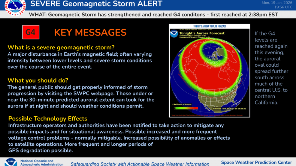 The National Oceanic Atmospheric Administration (NOAA) said a G4 Geomagnetic Storm Watch is in effect from late January 19 into January 20.