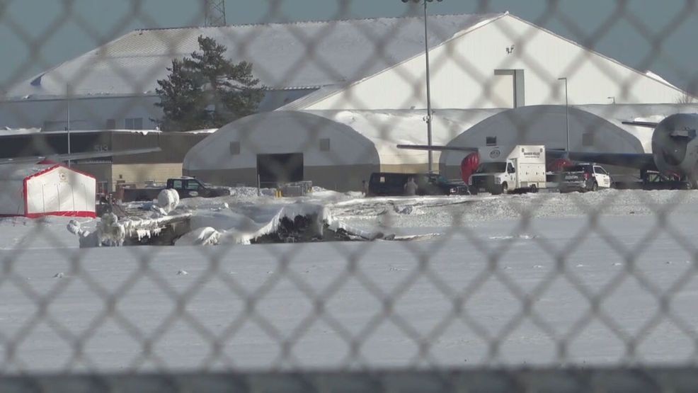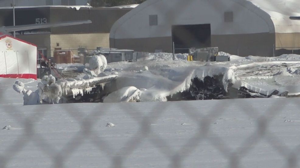 The director of the Bangor International Airport says what's left of the Bombardier Challenger 600 remains on the tarmac encased in snow, ice, and frozen firefighting foam.
