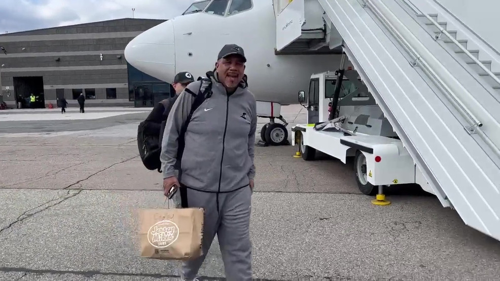 Providence College head coach Ed Cooley boards the team's plane bound for Greensboro, North Carolina, and the NCAA Tournament, Wednesday, March 15, 2023. (WJAR)